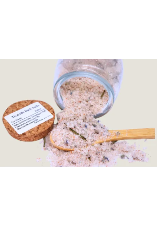 "Thulisile", a calming Zulu name meaning “she who brings quiet”, is your gentle companion for winding down and embracing deep, restful sleep. Crafted with a tranquil blend of Epsom salt and Himalayan salt, Thulisile works to relax tired muscles, ease tension, and quiet the mind. Infused with the soothing aromas of chamomile and lavender essential oils, this blend prepares your body for a state of stillness and serenity.